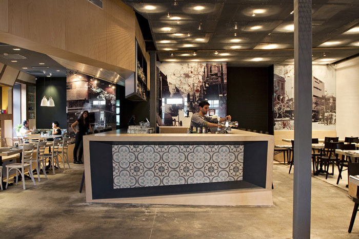 这是一个咖啡餐厅设计,一方面散发着烹饪的氛围,同时,另一方面,又引领着以色列的文化,在架子上展示着文学,音乐,艺术和建筑等。