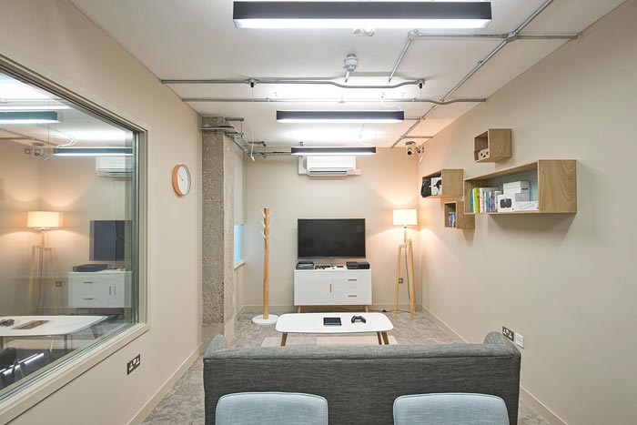 [办公室装修设计] 进门区域的设计:设计师在设计的时候,将前台与接待区域融合在一起,这样设计的好处就是可以将两个空间浓缩在一起,以此减少空间的负担,为其他空间创造出更多的使用空间,客户进门后看到的就是the insight rooms(洞察室),这样表现了企业的文化与追求,企业希望在不断的探索与洞察当中为未来做出一定的推测。